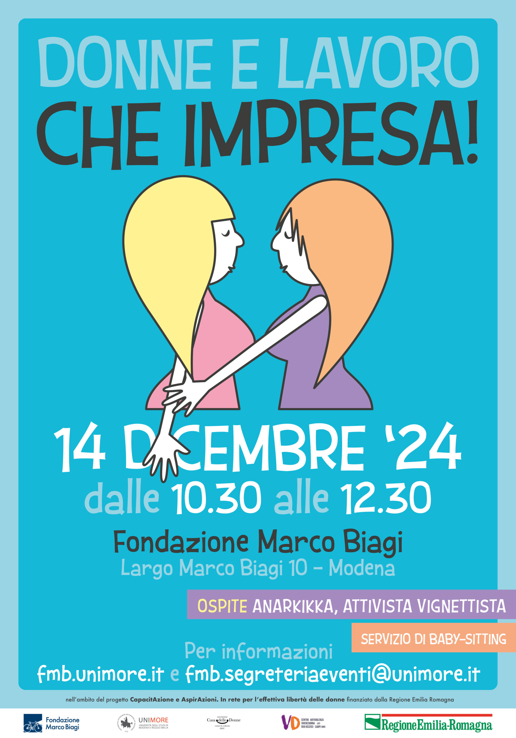 Per la Fondazione “Marco Biagi” dell’Università di Modena e Reggio Emilia, la Casa delle Donne di Modena e VivereDonna APS di Carpi, Anarkikka ha realizzato e illustrato il toolkit per le aziende “Donne, che impresa!”, a conclusione del Progetto “CapacitAzione e AspirAzioni. In rete per l’effettiva libertà delle donne”, contro le molestie sul lavoro. Il 14 dicembre il progetto è stato presentato con una mostra evento.